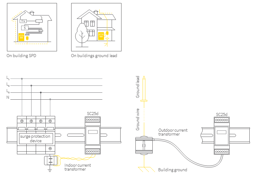 Surge Counter dapat dipasang pada kabel pentanahan bahkan pada instalasi yang sudah ada, dengan kemudahan pemasangan split core (CT / Current Transformer).